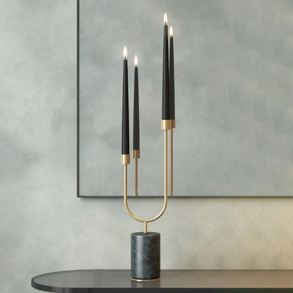 Изработен е от стомана и мрамор: Със солидна мраморна основа и изящни детайли в месинг и тъмнозелено, свещникът Grasil предлага уникална визия с огромна елегантност. Естествените вариации на мрамора са прекрасна основа за интериорния дизайн, а мрачните вечери са красиво осветени с тези свещници. Подходящите свещи (не са включени в комплекта) се предлагат отделно чрез аксесоарите. забележки към продукта: Изработени от стомана и мрамор. Доставя се без свещи (вж. аксесоарите) Инструкции за грижа: За да отстраните мръсотията и праха, избършете изделието с кърпа, напоена със смес от мек почистващ препарат и топла вода. Избягвайте да драскате с кърпа за почистване, която може да повреди повърхността.
