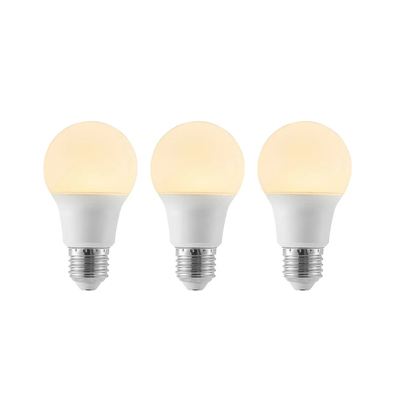 Опално бяла LED лампа E27 A60 8W с топъл бял цвят на светлината (3 000 K) в комплект от 3 броя Тази поликарбонатна LED лампа е много здрава и може да се използва като заместител на обикновена 60 W крушка в много осветителни тела. Тя не може да се димира - LED лампата се доставя в практичен комплект от 3 броя