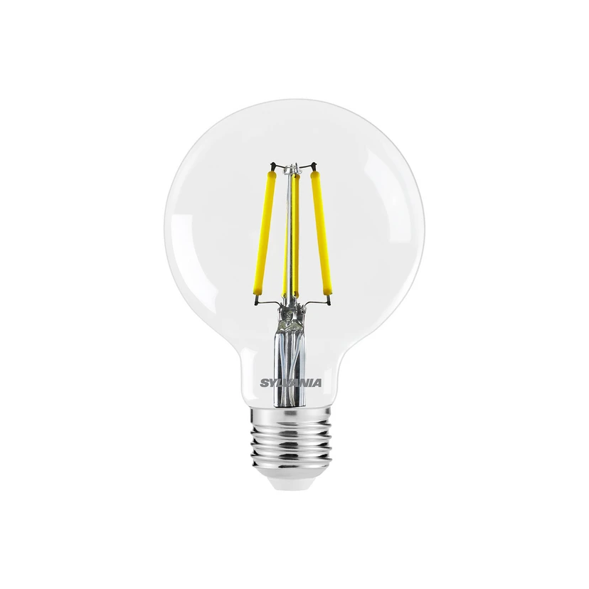 Светодиодна крушка E27 G95 4W 2700 K с нажежаема жичка от Sylvania Светодиодната крушка с цокъл E27, прозрачно стъкло и вградена светодиодна жичка е първокласен избор по отношение на устойчивостта и опазването на околната среда, тъй като е не само изключително икономична, но и особено дълготрайна. Стъклената лампа с топъл бял цвят на светлината изглежда особено привлекателно в отворени осветителни тела или широки абажури. С експлоатационен живот от 50 000 часа тя издържа три пъти повече от конвенционална LED лампа за модернизация и спестява до 95 % енергия в сравнение с конвенционална лампа с нажежаема жичка. Тази високоефективна и декоративна LED лампа може да се използва както в частни стаи, така и в хотели, ресторанти и много други търговски площи - Клас на енергийна ефективност А - Топлобял цвят на светлината (2700 K) - Без димиране