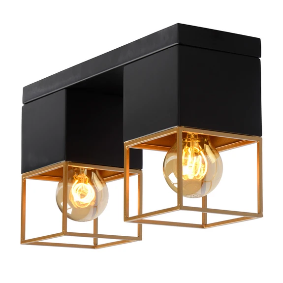 Двусветлинна лампа за таван Rixt - дискретни светлинни източници създават уютна атмосфера Лампата за таван Rixt съчетава няколко форми, които чудесно хармонират помежду си. Издълженият правоъгълник е затворен и представлява основата, която се монтира на тавана. Отляво и отдясно е добавен черен, затворен куб. Над кубовете са поставени рамки в месингов цвят, които служат като отворени абажури и освобождават светлината от лампите в стаята. Месинговите елементи осигуряват отразяването на светлината, като й придават още по-топъл цвят - с възможност за външно димиране