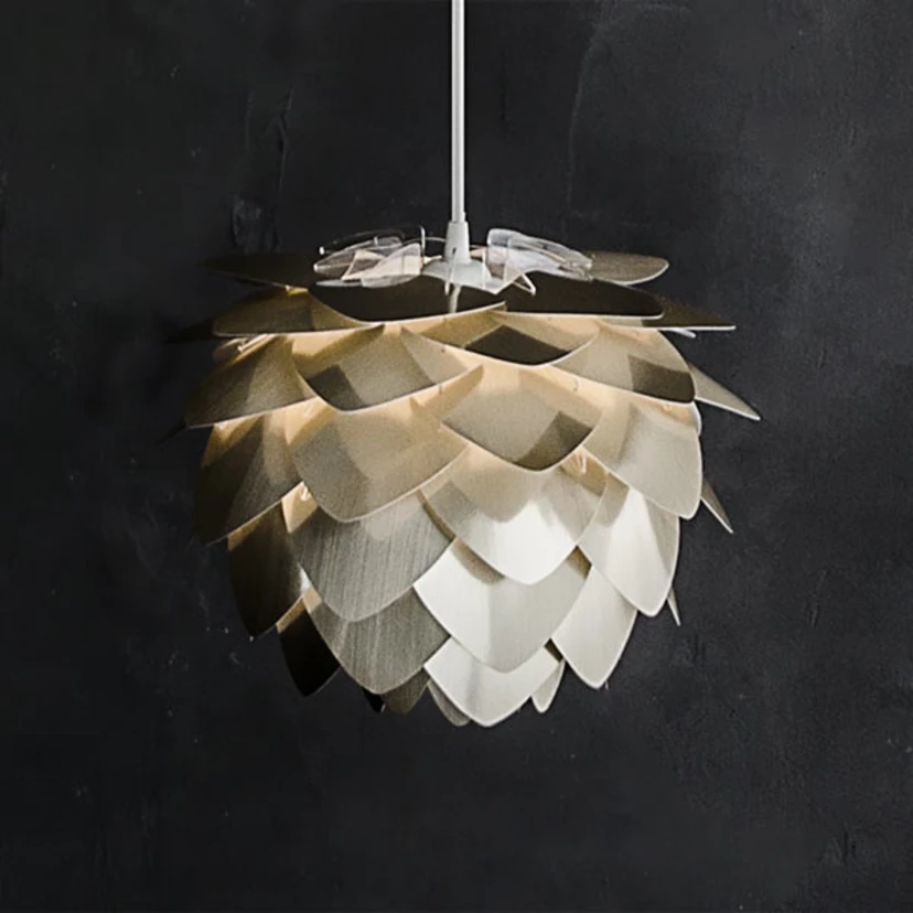 Месингова мини висяща лампа Silvia - абсолютна атракция за окото Дизайнерската мини висяща лампа Silvia привлича вниманието преди всичко с необичайния си дизайн на абажура: Безбройните, много органични на вид елементи, изработени от нечуплива пластмаса, са свързани помежду си и образуват структура, която наподобява екзотичен плод благодарение на триъгълната форма на листата на отделните части. На листата е придадено покритие в цвят матиран месинг, което придава допълнителен колорит на светлинното излъчване и създава атмосферно осветление. Дизайнерският екип на UMAGE е успял да създаде модерна класика, която се съчетава с почти всеки стил на обзавеждане и отразява естествената естетика на скандинавския дизайн с вечния си вид. В допълнение към функционалните, техническите и дизайнерските аспекти, при производството на Silvia е обърнато внимание и на екологичните аспекти и устойчивостта.