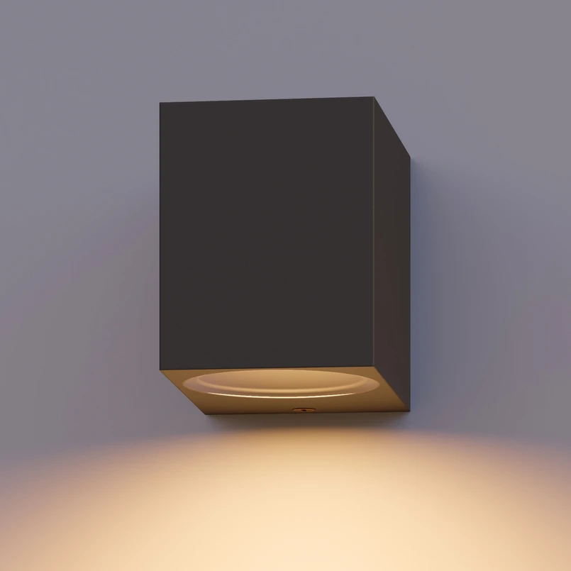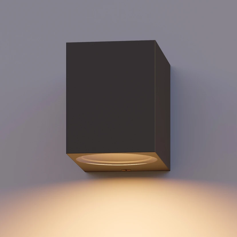 Външна стенна лампа Cuboid LED с цокъл GU10, осветително тяло Тази външна стенна лампа се използва за модерно акцентно и ориентировъчно осветление на фасади и входни пространства. Алуминиевият корпус е проектиран в семпла кубовидна форма и е с монохромно покритие. Зад стъклен капак от долната страна се намира цокъл GU10, който може да се оборудва със светлинен източник по ваш избор. - Степен на защита: IP54