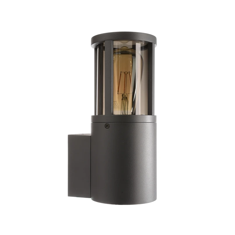 Външна стенна лампа Facado II с цилиндричен дизайн в тъмносив металик Facado II е модерна външна стенна лампа, която осветява външното пространство от всички страни. Алуминиевият корпус има цилиндрична форма и тъмносиво метално покритие. Светлината от крушката E27 се излъчва отвсякъде през поликарбонатен капак - IP защита: IP65