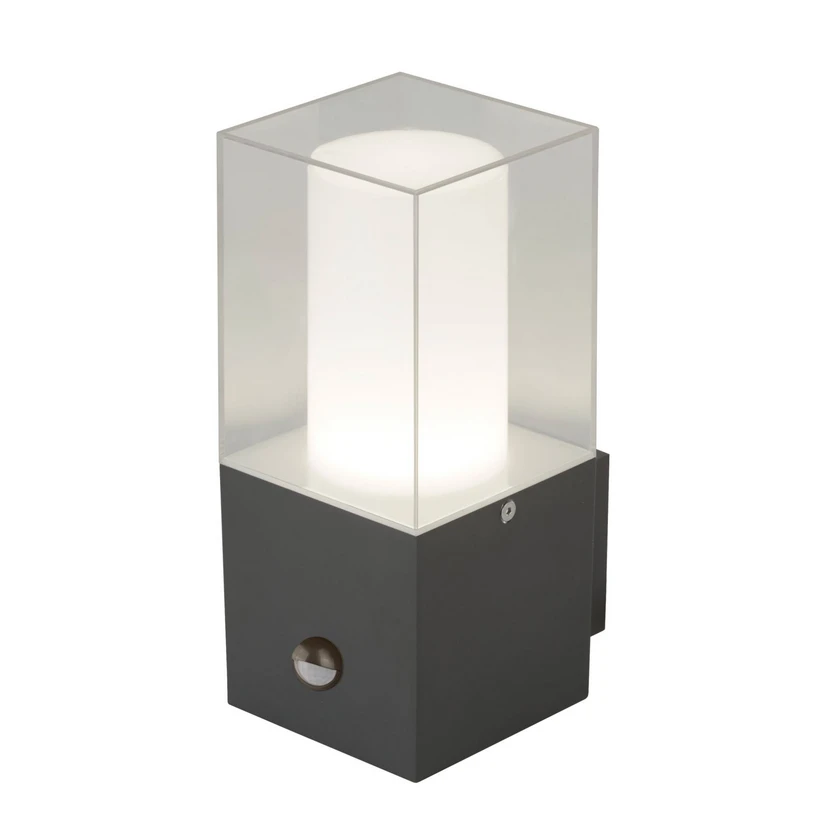 Тъмно сива външна стенна лампа Granada със сензор за движение Стенната лампа Granada за външна употреба изглежда така, сякаш е изработена от едно цяло парче. Granada е оборудвана с PIR сензор за движение и включва светлината само при засичане на движение. Това означава, че осветителното тяло се включва само когато е необходима светлина и може да се спестят разходи за енергия в сравнение с постоянното осветление. Granada има модерен външен вид, което я прави източник на светлина, който може да се комбинира по различни начини. Технически данни на сензора: - Ъгъл на засичане: 90° - Обхват на засичане: 2-8 м - Макс. височина на монтиране: 1,8 м - Настройка на времето: мин. време +10/-5 сек; макс. време +4/-1 мин