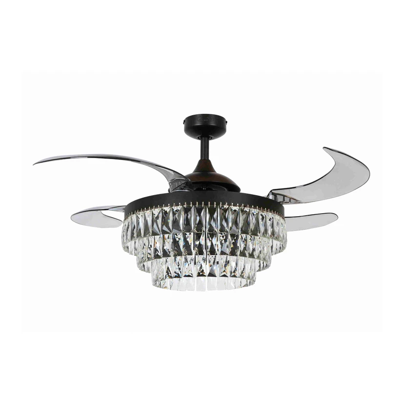 В кристална визия - осветен вентилатор за таван Fanaway Veil с четири разтегателни лопатки и дистанционно управление Fanaway Veil предлага елегантна комбинация от класическа кристална лампа за таван и вентилатор. Четирите акрилни лопатки се разтягат само в режим на вентилатор; когато се използват единствено като таванно осветление, те изчезват над корпуса. Четирите доставени топло бели LED лампи за свещи E14 с вид на нажежаема жичка са разположени над висящ кристален елемент, който осигурява искрящо осветление. През лятото Fanaway Veil осигурява прохладен бриз. През зимата реверсивната посока на движение подпомага функцията за отопление. Подходящ е и за окачени тавани. Функции: Fanaway Veil е оборудван с променливотоков двигател, който позволява три нива на скорост и обратима посока на въртене (регулира се на корпуса). Доставени са подходящи светлинни източници. Функциите на вентилатора и осветлението се управляват с помощта на приложеното дистанционно управление. Технически данни: - Скорост на двигателя: 255/195/141 об/мин - Мощност на двигателя: макс. 56 W - Циркулация на въздуха: макс. 180 m³/min Забележка: Приложеното дистанционно управление изисква две батерии ААА (не са включени в комплекта).
