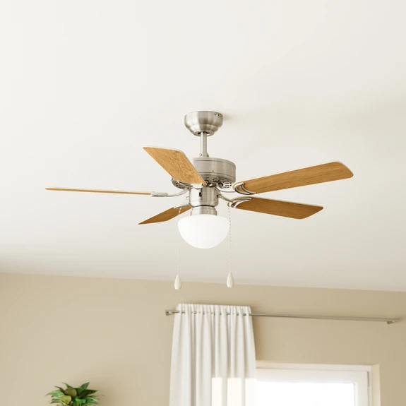 Вентилатор за таван Cadiz с осветление с цокъл E27 Вентилаторът за таван Cadiz се състои от метален корпус на двигателя и пет лопатки от MDF, които са проектирани по различен начин от всяка страна и могат да се завъртат, за да променят външния вид на вентилатора. Осветителното тяло е снабдено с бяло опалово стъкло и цокъл E27, в който може да се монтира светлинен източник по ваш избор (макс. 40 W). Светлината се включва и изключва директно върху вентилатора с помощта на двете издърпващи се верижки, а вентилаторът може да се настройва на 3 различни нива на скорост. Възможно е също така да се превключва между лятна и зимна работа. Благодарение на обратимата посока на въртене (лятна и зимна работа) вентилаторът може да се използва през цялата година и осигурява приятен климат в стаята - през лятото с приятен бриз, а през зимата с равномерно разпределение на топлия въздух в стаята. Таванният вентилатор с класически дизайн е оборудван с променливотоков двигател. Той е идеален за помещения с площ от 13 до 20 m² и може да се монтира на наклонени тавани с ъгъл на наклона до 13°. Доставя се без източник на светлина - Минимално разстояние между пода и лопатките на ротора 2,3 м Технически данни - Мощност на двигателя 55 W - Ниво на шума 47,9 dB - Ъгъл на наклона на лопатките 11°