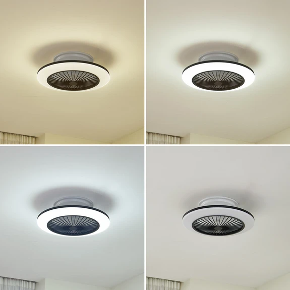 Модерен вентилатор за таван с LED осветление, димируем, с възможност за регулиране на цвета на светлината Вентилаторът за таван Mamuti LED съчетава модерен дизайн с голяма функционалност. Светодиодното осветление може да се регулира с дистанционно управление, а цветът на светлината (бял) може да се контролира. Различните скорости на вентилатора също могат да се контролират по този начин. Технически данни Мощност за скорост: - 35 W при 1140 об/мин - 30,4 W при 950 об/мин - 27,2 W при 760 об/мин - Максимален обемен поток: 32,73 m³/min - Максимална скорост на въздуха: 2,23 m/sec - Ниво на звукова мощност на вентилатора: 47,1 dB (A) - Сервизна стойност (SV): 1,07 (m³/min)/W