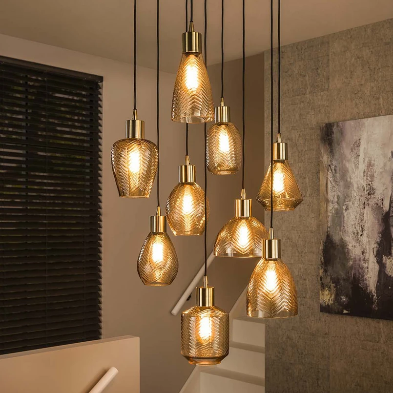 Висяща лампа Leaf с девет лампи - стъклени абажури с редуващи се дизайни Висящата лампа Leaf е елегантен избор за централен източник на светлина в стаята. Деветте абажура, изработени от текстурирано стъкло с кехлибарен цвят, са с редуващи се форми и висят на различна височина под черния кръгъл сенник. Метални капачки в месингов цвят над абажурите завършват висящата лампа Leaf. Препоръчват се крушки с нажежаема жичка с рустикална форма ST64.