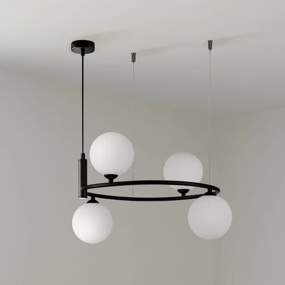 Концепция за осветление Maytoni Ring: елегантност и функционалност Открийте висящата лампа Maytoni Ring - стилно допълнение към всеки хол, кухня или трапезария. Модерният дизайн в черно и бяло се вписва безпроблемно в съвременния интериор и създава атмосфера, която е едновременно уютна и вдъхновяваща. Стъклената лампа с четири лампи е не само визуален акцент, но и гарантира атмосферно осветление, което влияе положително на настроението в стаята. Въпреки че в комплекта не е включен димер, яркостта може да се регулира индивидуално с външен димер, за да се създаде перфектната атмосфера за всеки случай. С висящата лампа Maytoni Ring можете да изпитате завладяващия ефект на светлината във вашия дом.