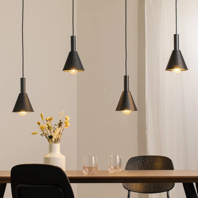 Черно висящо осветително тяло Norte с четири конусовидни абажура, отворени в долната част Четирисветовото висящо осветително тяло Norte, изработено от стомана с черно покритие, е атрактивен избор за осветяване на маси и плотове в модерни дневни и салони. Четирите абажура висят в редица под дълъг балдахин, като всеки от тях е проектиран като конус, отворен в долната част, и побира крушка E27. Производството се извършва в Европа.