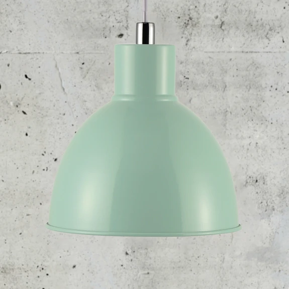 Хармонична висяща лампа Pop с форма на купол Абажурът на висящата лампа Pop е проектиран като купол, който се отваря надолу. В съчетание с едноцветното лаково покритие резултатът е визуално сдържана висяща лампа, която е подходяща за директно осветление в много различни интериори - особено над хола и масата в трапезарията. Само малък метален елемент, чрез който задържащият кабел е свързан с абажура, осигурява визуален контрапункт.