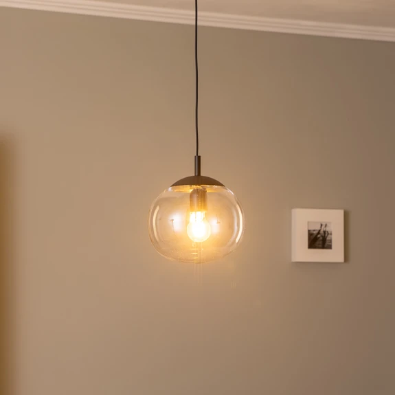 Стъклена висяща лампа Vibe с кръгъл абажур в прозрачен дизайн Висящата лампа Vibe е особено впечатляваща в модерните концепции за обзавеждане. Тя съчетава черни елементи с почти сферичен стъклен абажур. Прозрачният материал позволява поглед към интериора, така че декоративният светлинен източник E27 е перфектно подчертан.