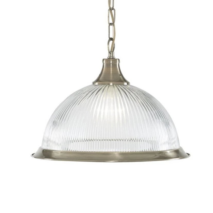 Проста елегантност - стъклена висяща лампа American Diner Тази специална висяща лампа е идеална за стилни трапезарии. Стилът ѝ напомня за епохата на класическата американска закусвалня, което е отразено и в името ѝ. Стъкленият абажур, изработен от рифеловано стъкло, е красиво допълнен и завършен с метални елементи с покритие от античен месинг в висящата лампа American Diner. Двата компонента се съчетават умело, за да създадат красив ансамбъл, който може да блести като висящо осветление, например над маси в трапезарията.