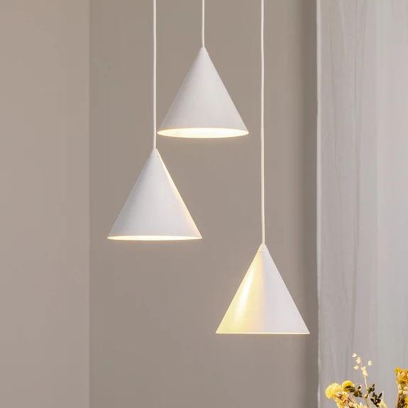 Висящо осветително тяло Cono като рондел с три лампи в бяло Трите абажура на висящото осветително тяло Cono са изработени от стомана във формата на непреходен конус, завършени са в матово бяло и са подредени като рондел върху кръглия сенник. Светлината се излъчва надолу, което прави висящото осветително тяло идеално за осветление на маса или площ.
