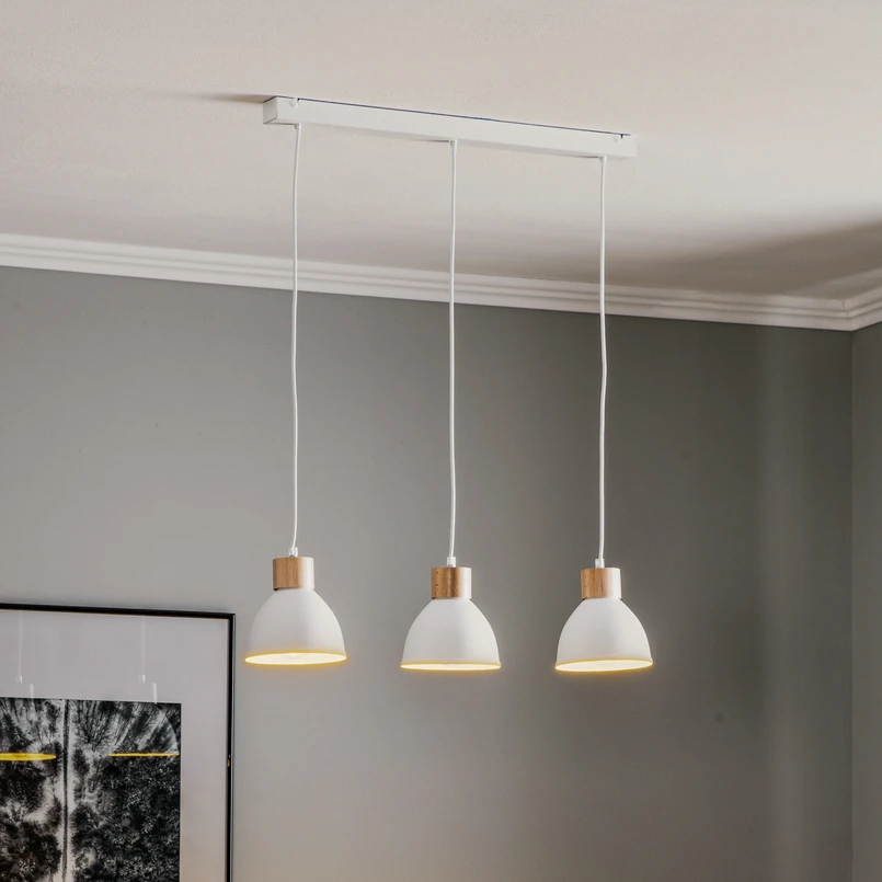 Трисветовна висяща лампа Tira с бели, кръгли абажури и светли дървени елементи Висящата лампа Tira е идеална за директно осветяване на маса или плот. Три стоманени абажура, отворени в долната част, висят в редица под дълъг балдахин, като всеки от тях съдържа източник на светлина. В допълнение към белите абажури, кабелите и балдахина към всеки абажур е добавена капачка от светла букова дървесина като контрастен елемент, която придава на висящата лампа естествен вид и умело допълва светлинния източник в скандинавски стил. - Произведено в Европа; управляеми транспортни маршрути и намалени емисии на CO2 - Дървесина със сертификат FSC® - Опаковка без пластмаса с рециклиран материал
