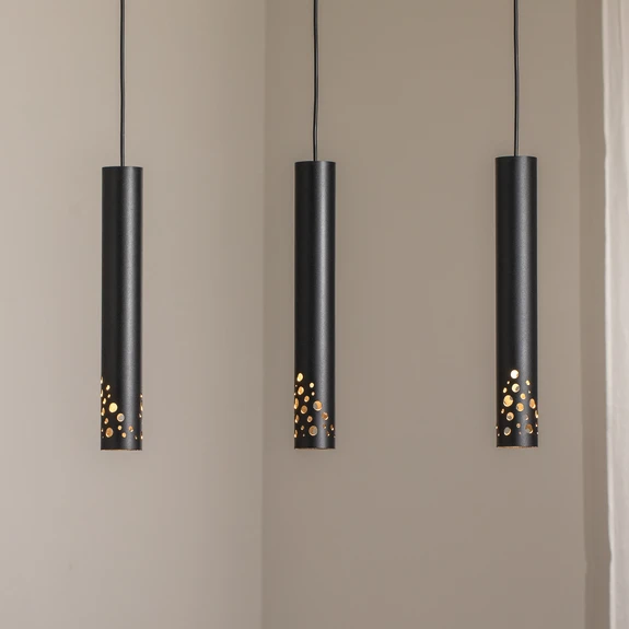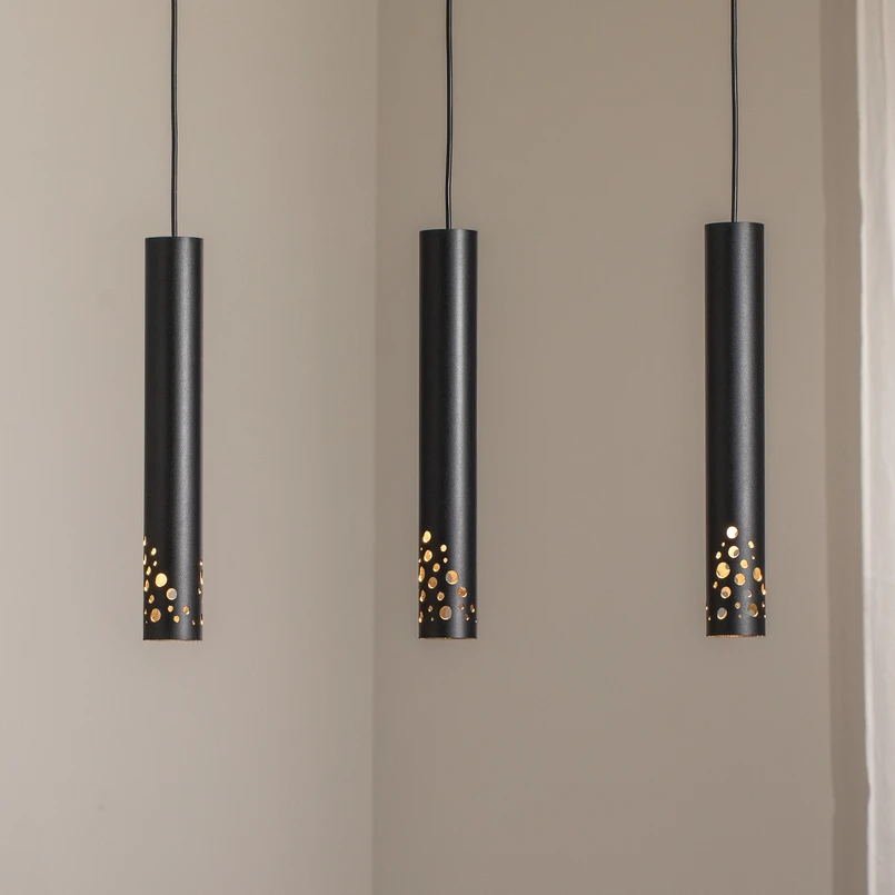 Трисветлинна висяща лампа Tibia в черно Трисветлинната висяща лампа Tibia впечатлява с цилиндричните си, тънки стоманени абажури, които имат ефектна перфорирана шарка в долната си част. Тези перфорации в абажурите създават особено красив светлинен ефект. Висящото осветително тяло Tibia е нещо повече от източник на светлина - то е дизайнерски елемент, който оказва значително влияние върху атмосферата на помещението. В абажурите са монтирани гнезда GU10, които могат да бъдат оборудвани със светлинни източници по ваш избор (макс. 8 W LED) - произведени в Европа