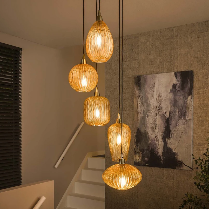 Висяща лампа V-Shape с пет стъклени абажура с кехлибарен оттенък V-Shape е елегантна висяща лампа с пет абажура, всеки от които е с индивидуална форма и е изработен от текстурирано стъкло с кехлибарен оттенък. Абажурите са подредени в рондел под черен, кръгъл метален сенник и висят на различна височина. Препоръчват се крушки с нажежаема жичка с форма А60.