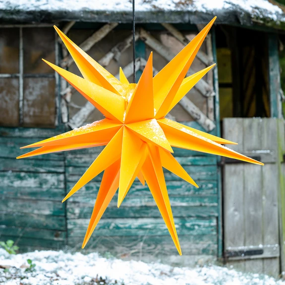 Джъмбо пластмасова звезда - 18-лъчева - украсява всеки имот Тази 18-лъчева звезда е предопределена за използване на открито благодарение на степента си на защита IP44, тъй като е защитена от пръски вода от всички страни. Дизайнът ѝ е напълно убедителен и тя блести с наситения си жълт цвят дори когато е изключена. Когато светлината се включи вечер, тя се вижда отдалеч и създава атмосфера на Коледа. Снабдена с 4-метров захранващ кабел - Диаметър: 100 см